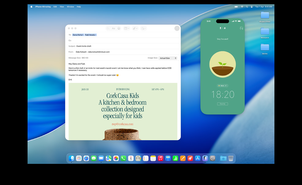 iPhone Mirroring lets you see and use your iPhone right from your Mac.4 So even if your phone is getting charged across the room, you can still access all your favorite iPhone apps. Live Activities from your iPhone also appear on your Mac. So when timely events occur, you don’t have to reach for your phone to stay in the know. You can even drag and drop a video from your Mac to your iPhone, so you can continue editing on the go.