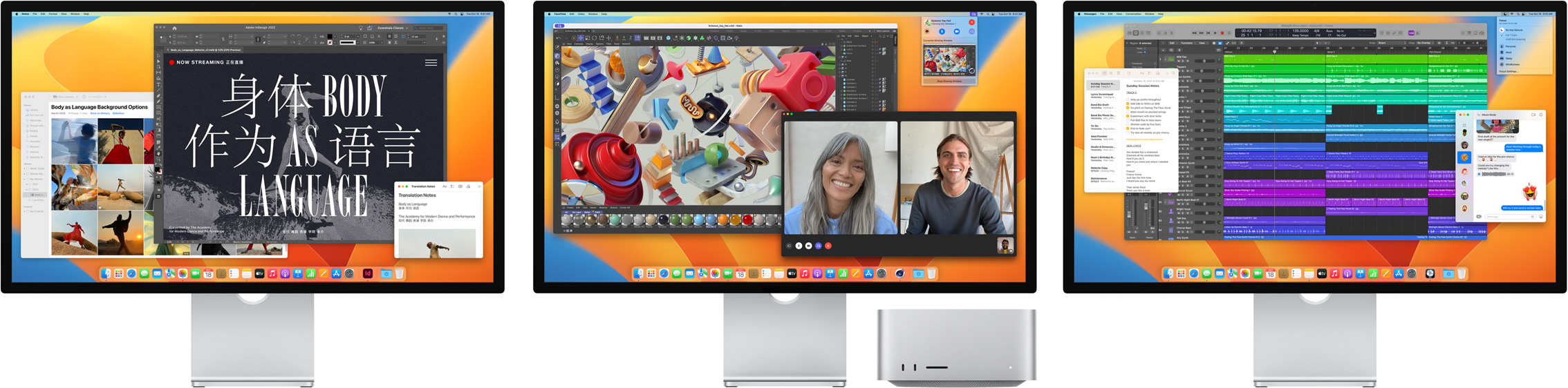 Our hardware and software are designed together. That integration is what enables amazing features like Center Stage and Spatial Audio. For pro workflows, macOS supports reference modes and fine-tune calibration so you can match industry standards — whether it’s HD and SD video or broader uses such as photography, web development, design, and print.