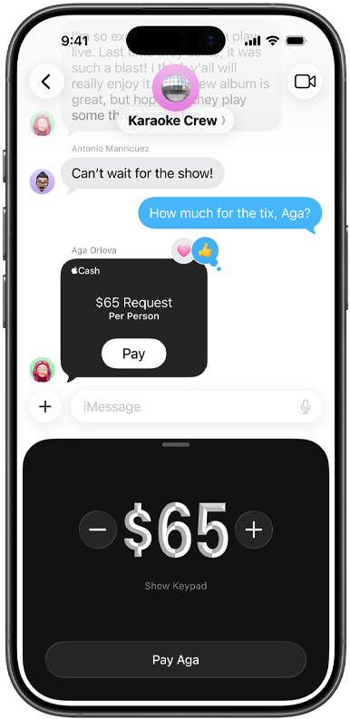 Apple Cash is an easy and private way to send and receive money,4 and it’s built right into iPhone. You can send Apple Cash in Messages, in Wallet, or with Tap to Cash by simply holding your iPhone near someone else’s. And because Apple Cash is a digital card in Wallet, you can spend your Apple Cash in stores, online, and in apps with Apple Pay.