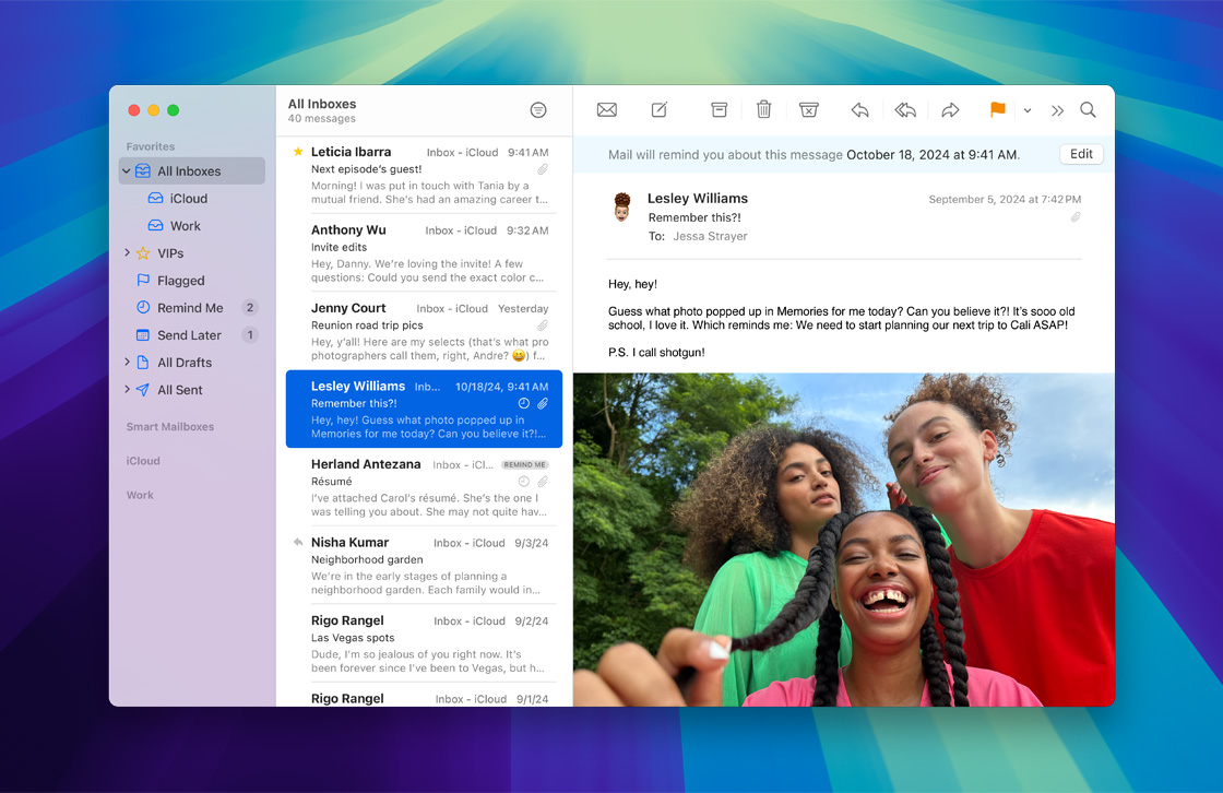 iCloud Mail ist nahtlos in die Mail App auf deinem iPhone, iPad oder Mac integriert und iCloud.com macht es einfach, von überall E‑Mails zu senden und zu empfangen. Sicherheitsfeatures wie Schutz vor Spam und Antiphishing sind integriert, um Spam Mails zu erkennen und zu blockieren, bevor sie in deinem Posteingang landen. Du kannst deine eigene @icloud.com E‑Mail Adresse ganz einfach einrichten. Mit einem iCloud+ Abo kannst du deine E‑Mail mit einer eigenen Domain personalisieren.