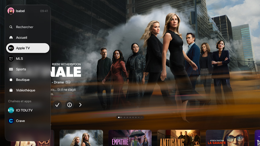 Plongez-vous dans les films et séries Apple Original primés, sans oublier les succès de Disney+, Netflix, Prime Video, Crave, ICI TOU.TV et bien d’autres3. Entraînez-vous comme les pros, découvrez des jeux enlevants, écoutez la musique de l’heure proposée en exclusivité par Apple et dénichez des milliers d’apps géniales sur l’App Store. Apple TV 4K, c’est beaucoup plus que de la télé.