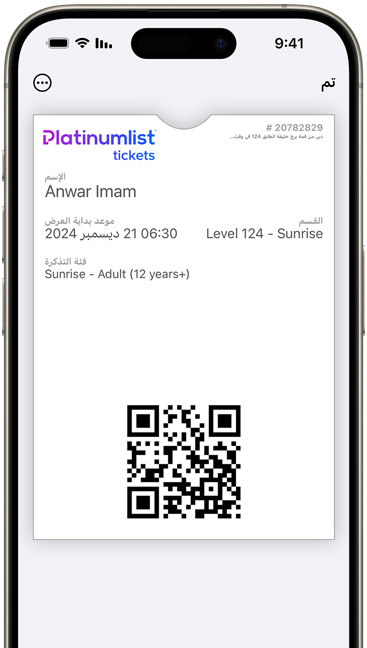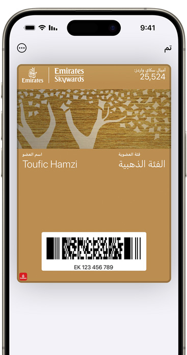• من السهل استخدام بطاقات مختلفة في تطبيق المحفظة من Apple. وقد يظهر بعضها تلقائياً بحسب الوقت والموقع، مثل بطاقة صعود الطائرة التي تظهر لك فور وصولك إلى المطار.
