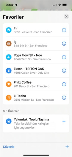 Tercih edilen ulaşım biçimi, bildirilen sorunlar ve favoriler gibi en çok kullandığınız ayarların tümünü tek bir yerden görüntülemek için Harita’yı açıp ekranın alt kısmındaki kullanıcı hesabı fotoğrafınıza dokunun. Harita’yı aygıtlarınızda veya CarPlay ile araç ekranınızda açtığınızda en sık ziyaret ettiğiniz yerler gösterilir. Böylece ev, iş yeri, spor salonu, çocuğunuzun okulu, en yakın benzin istasyonu veya favori restoranınız her zaman yalnızca bir dokunuş uzağınızda olur.